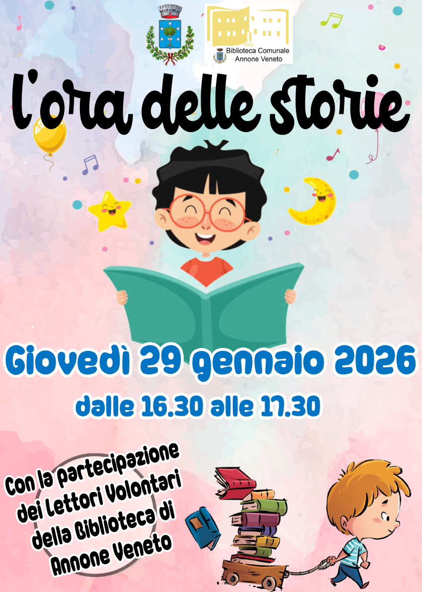 Giovedì 29 gennaio 2026 dalle 16.30 alle 17.30 nei locali retrostanti la Biblioteca Comunale i Lettori Volontari sono felici di presentare L'Ora delle Storie.